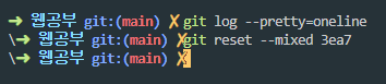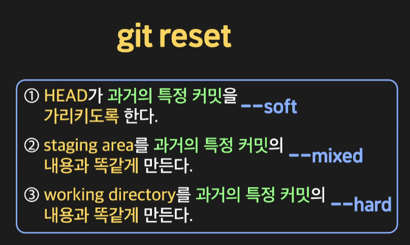 그게아닌 헤드의 위치만 과거의 커밋으로 바꾸고 워킹 디렉토리는 건드리고 싶지 않을 때 mixed,soft 옵션을 쓰면된다.