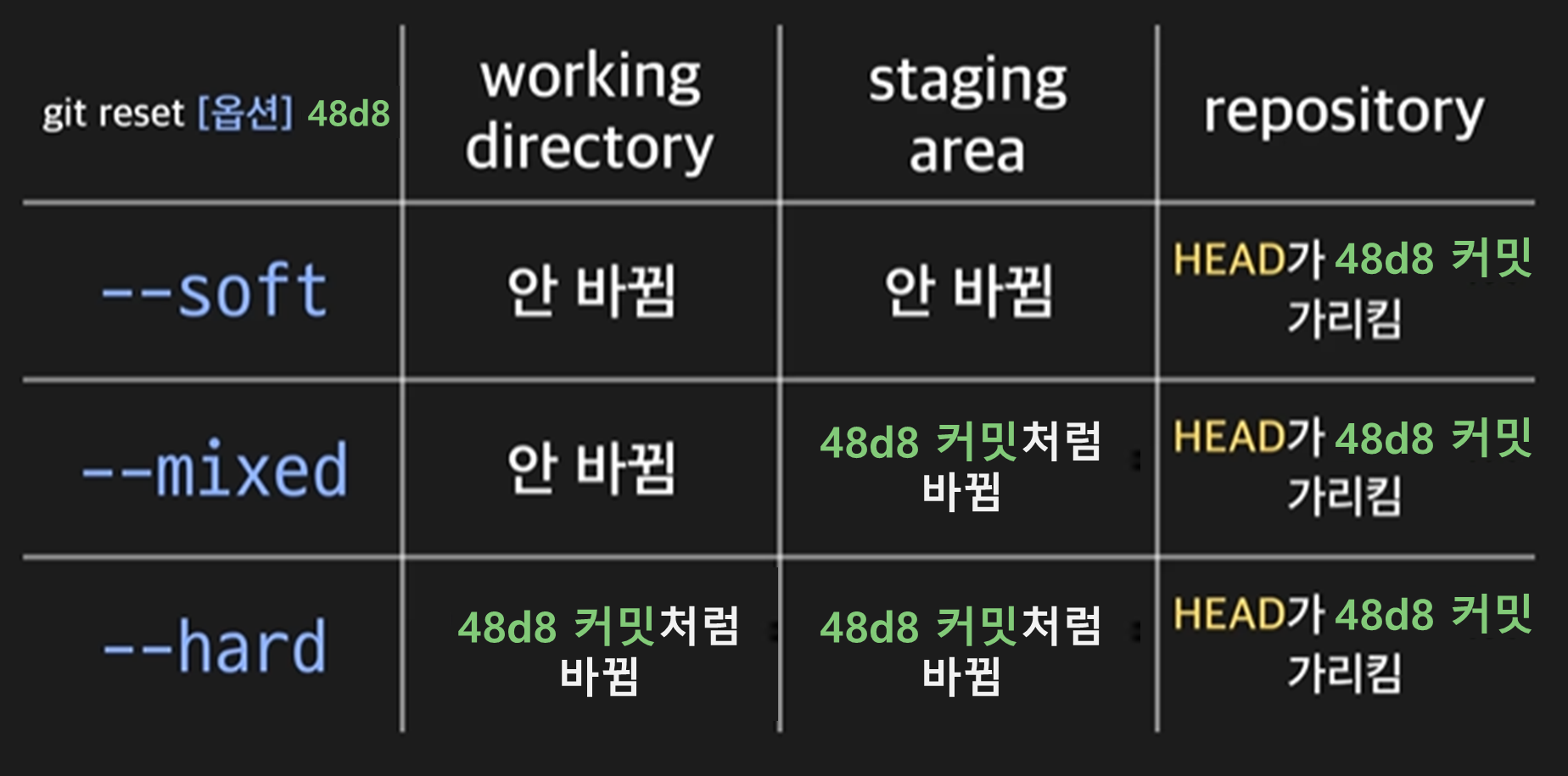 이 표는 git reset 뒤에 옵션을 쓴 다음 커밋 아이디 앞 4자리를 작성한 상황 (48d8)을 나타낸다.