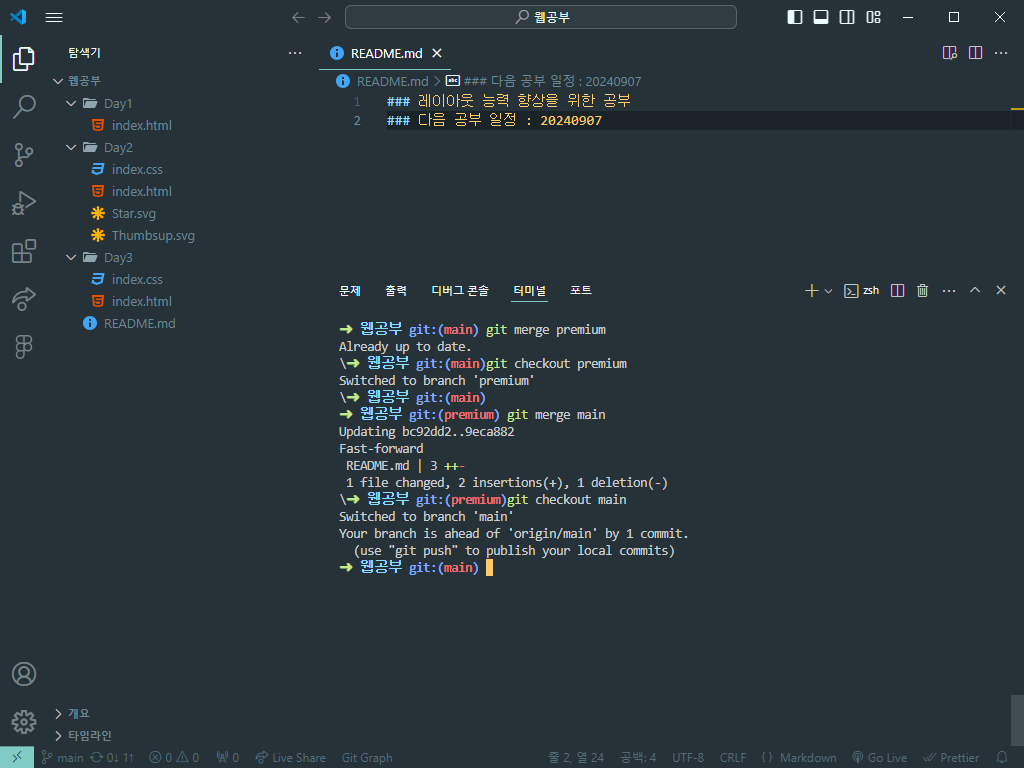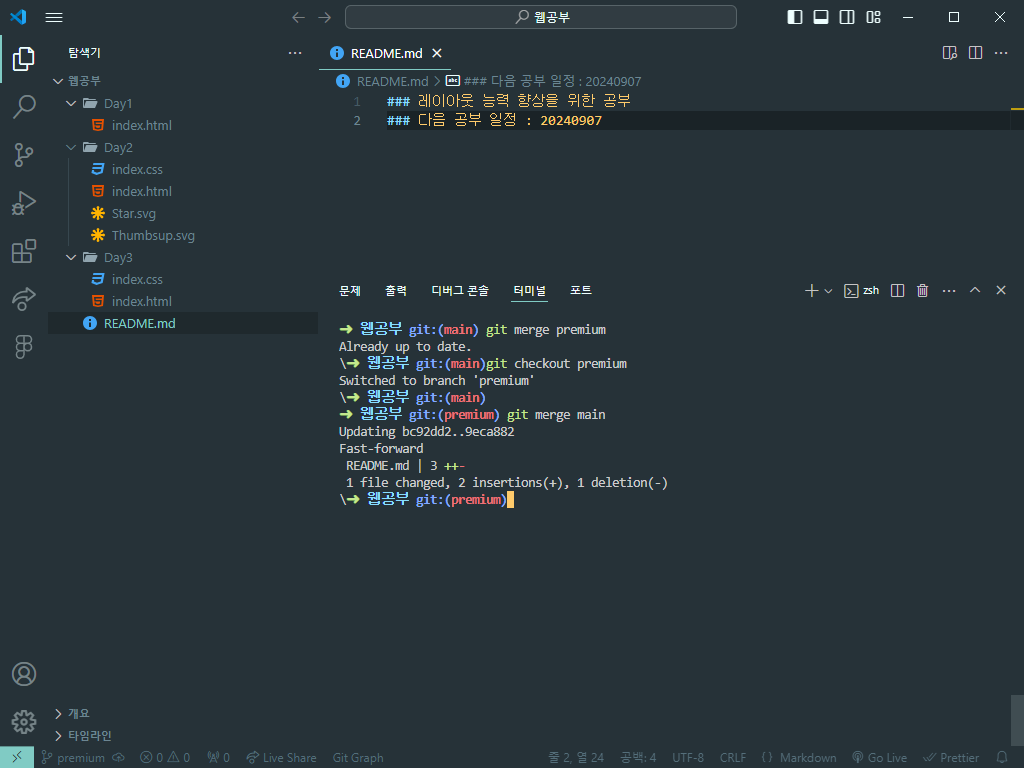 main 브랜치에 추가했던 문구가 premium 브랜치에 생겼다.