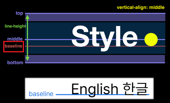 1. baseline: vertical-align의 기본값. 이미지와 텍스트 등의 요소는 기본적으로 이 baseline을 기준으로 배치가 된다. 글자가 앉아있는 선이다. 한글과 다르게 영어소문자에만 있는 g, j, p, q, y와 같이 끝이 밑으로 내려가는 부분(decender)은 baseline 밑으로 내려간다. 2. top: vertical-align상의 상단부분. 3. bottom: vertical-align상의 하단부분. 4. middle: vertical영역의 중간이 아닌 알파벳 소문자의 중간이 middle값이 된다. 폰트 종류가 바뀌게 되면 middle값도 상대적으로 바뀌게 된다. (만약 텍스트와 이미지를 나란히 놨을 때 이미지에 vertical-align: middle속성값을 넣으면 이미지는 텍스트의 소문자