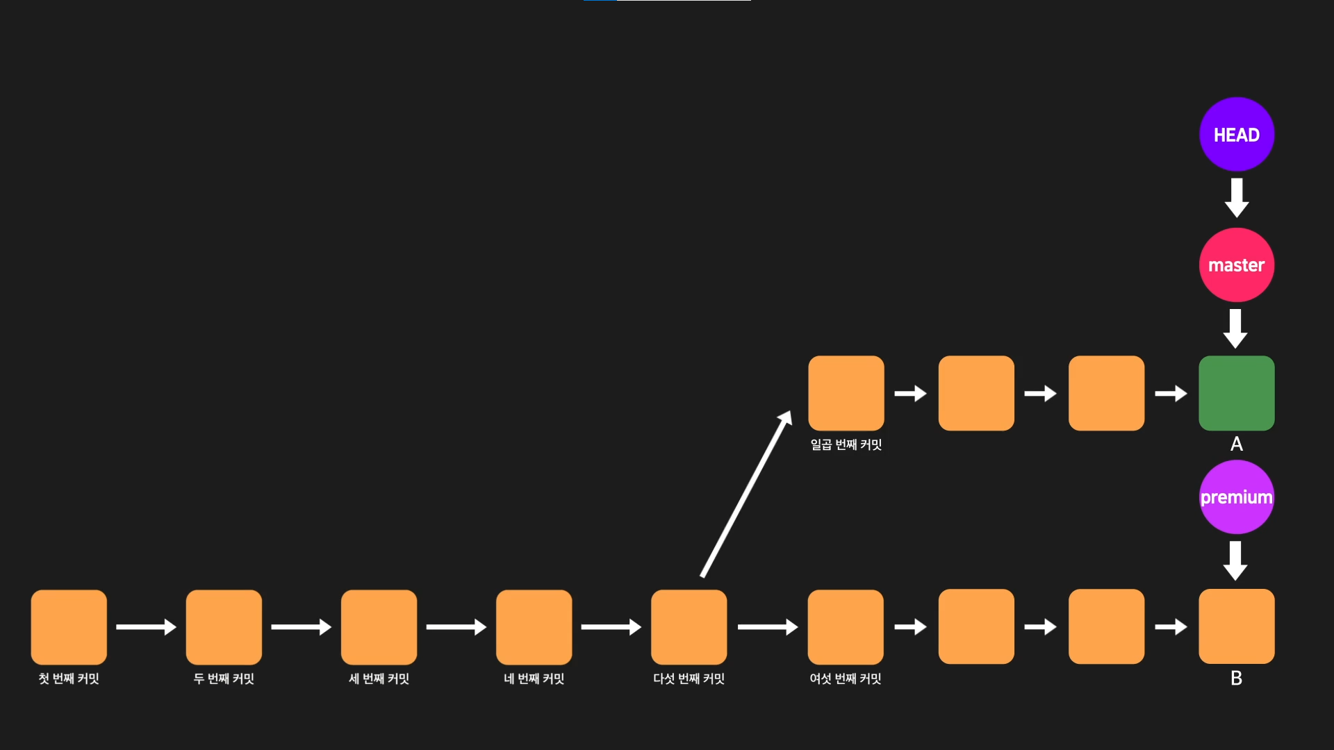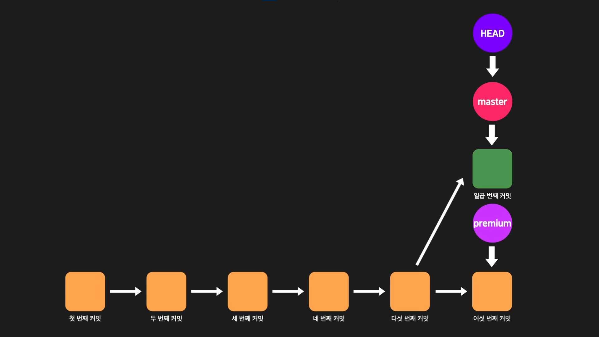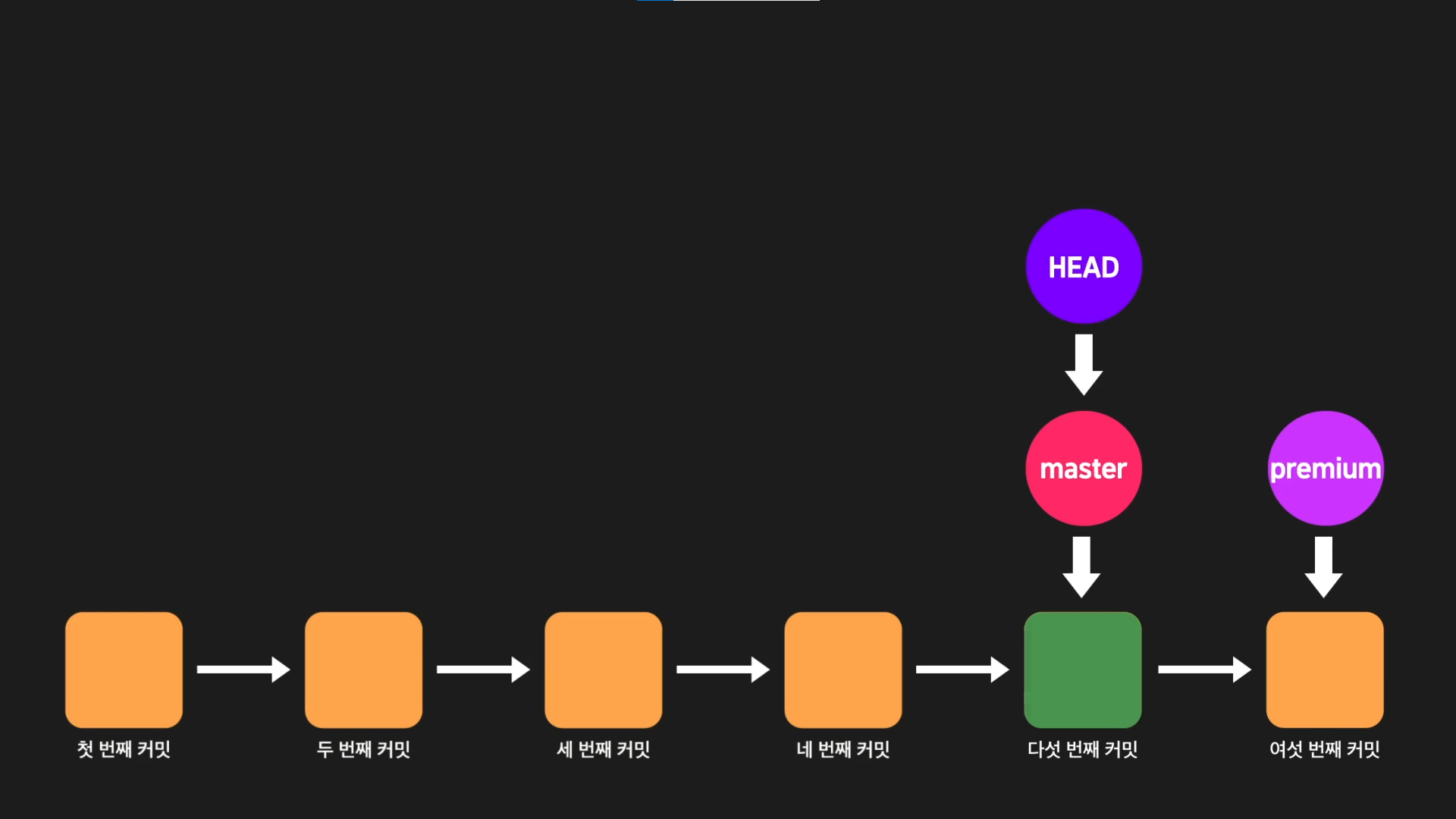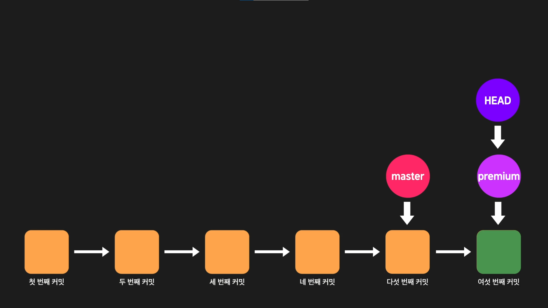 또 커밋을 하게되면 여섯 번째 커밋이 생기고 HEAD가 가리키던 premium branch가