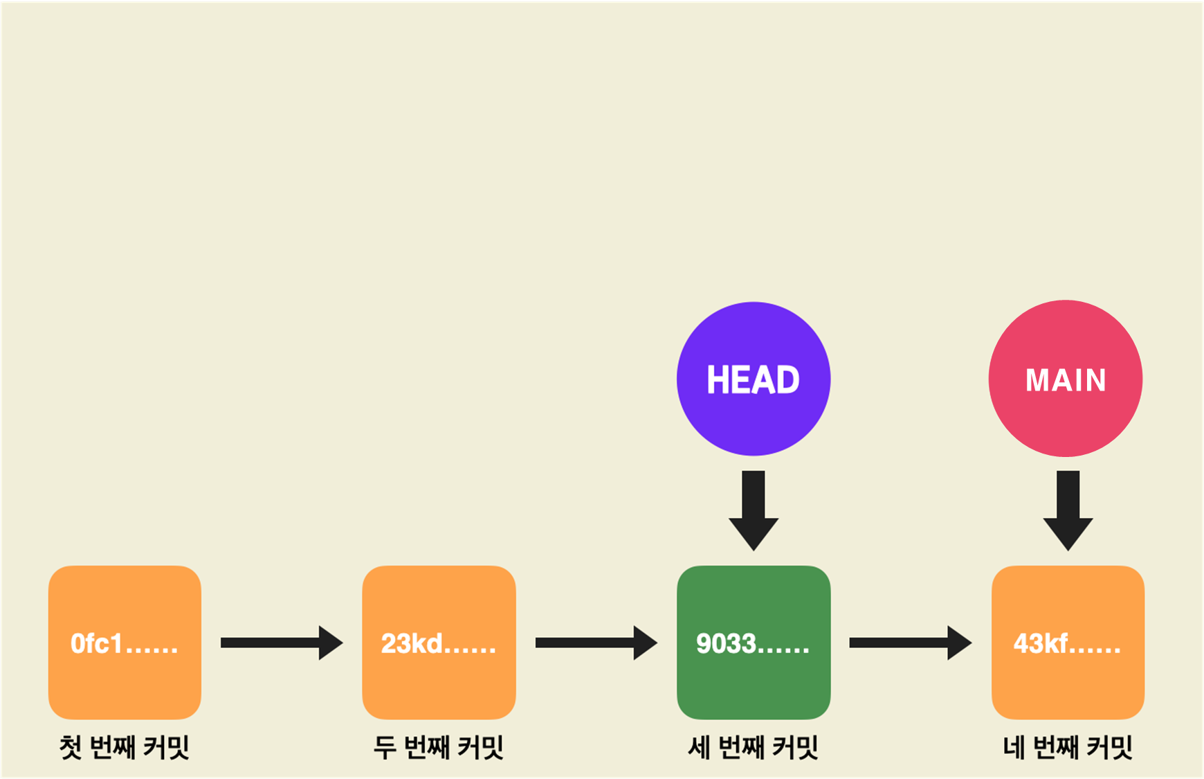 = HEAD가 main 브랜치가 가리키던 커밋을 간접적으로 가리키게 됨으로써