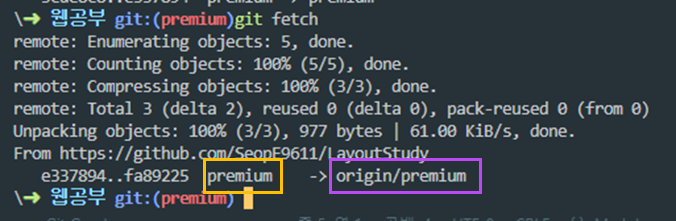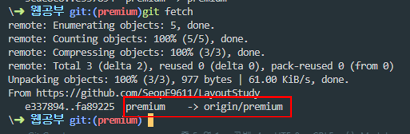실행 해보면 오리진에 있던 premium brancgh의 커밋이 로컬 레포지토리로 들어오게된다.