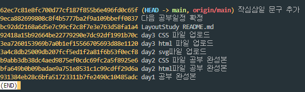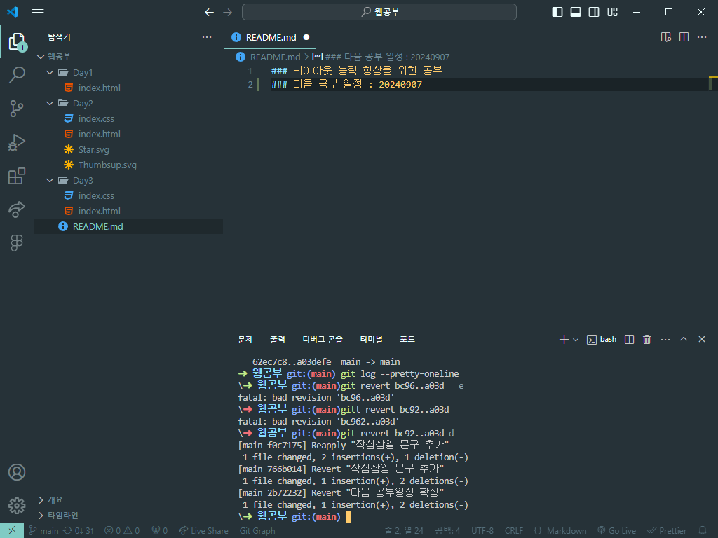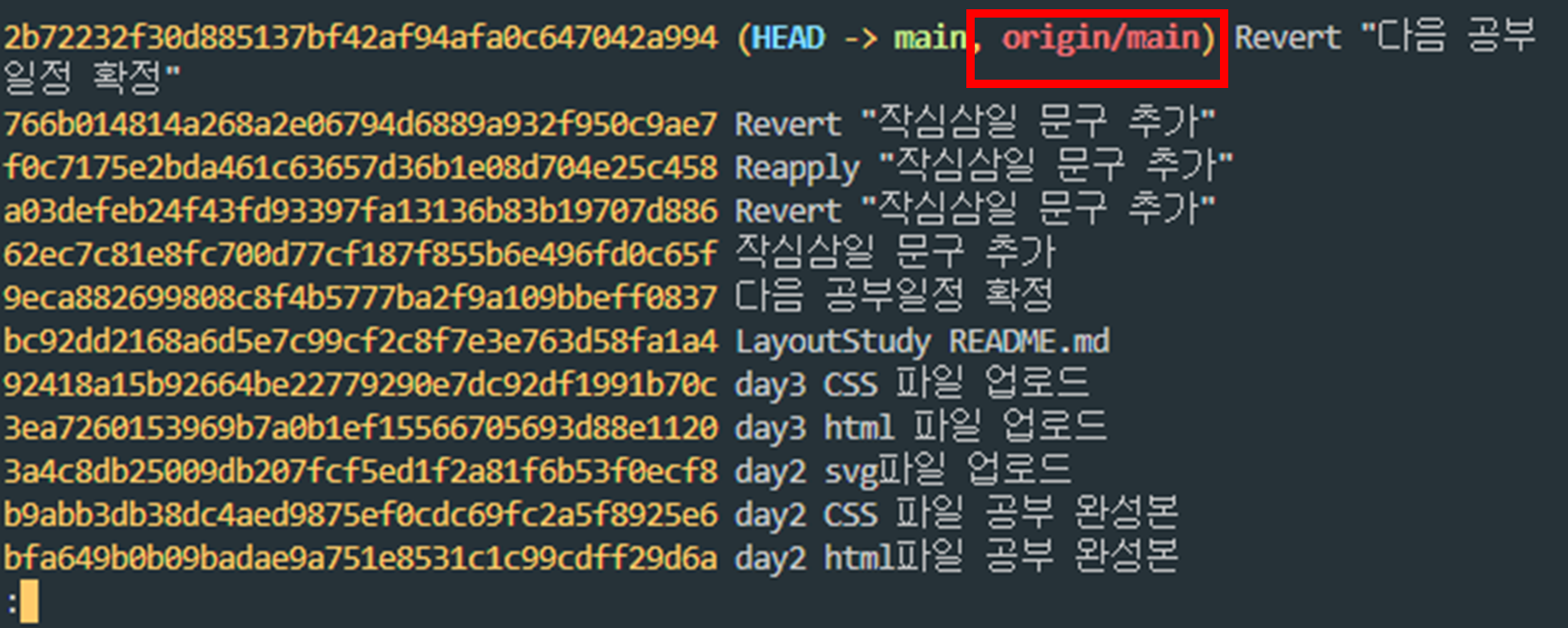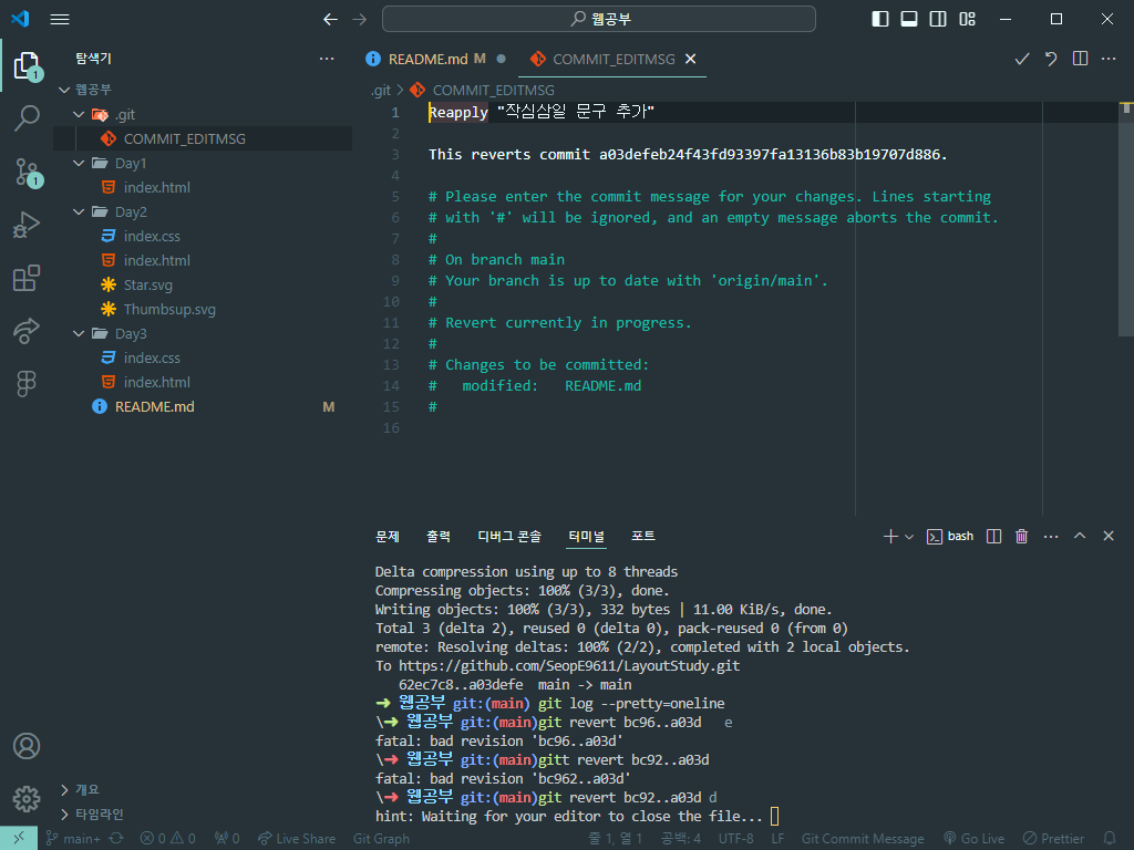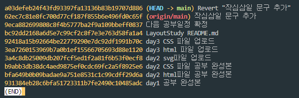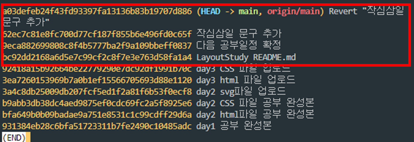 작심삼일 문구는 직접 지우지 않았지만 단지 git revert라는 커맨드를 실행해서 작업을 되돌리는 커밋을 새로한것.
