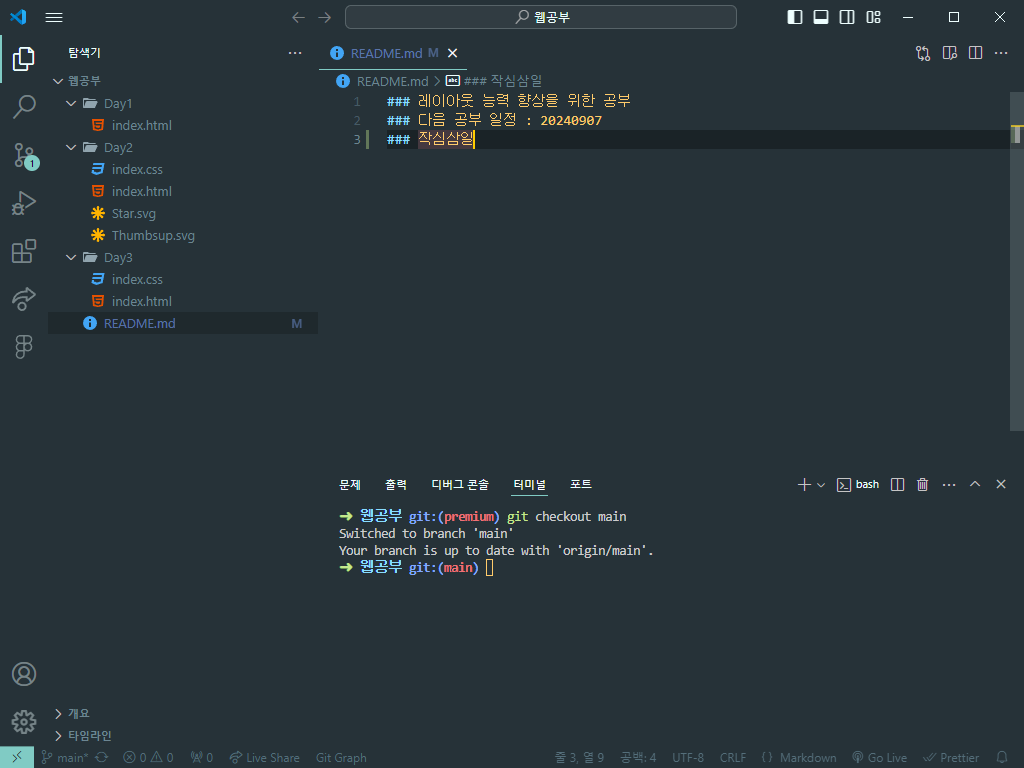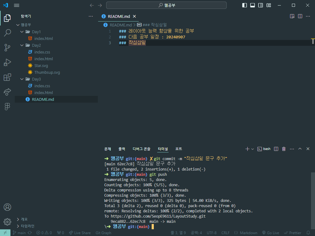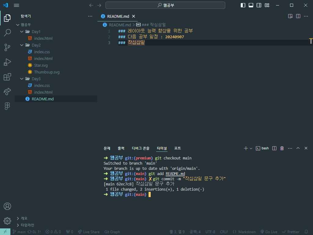 '작심삼일' 이라는 문구를 넣어서 저장해주고 터미널에서 커밋해준다.