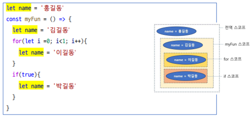 • 스코프란 { } 로 묶이는 코드의 영역을 의미하며