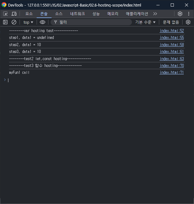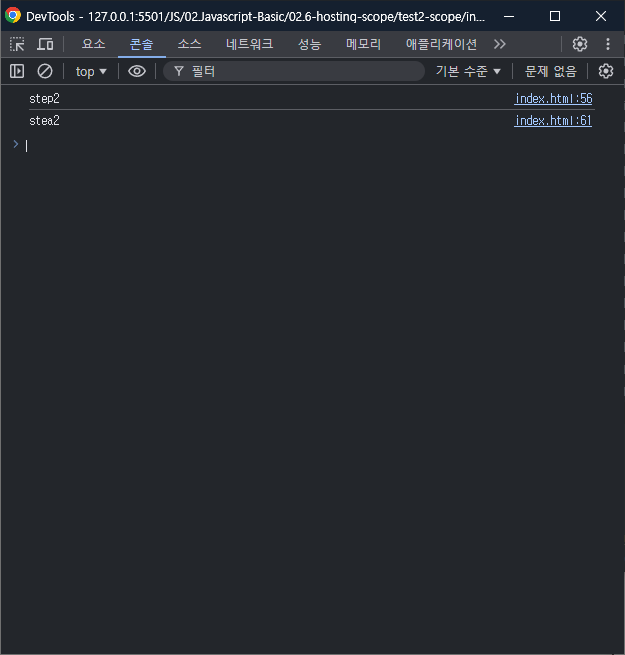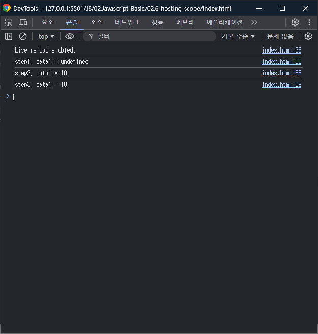 윗 부분이 실행될때는 변수가 선언되지 않은 상태가 됨으로 에러가 발생되어야 하는데