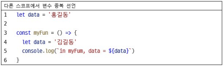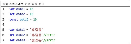 • 동일 스코프내에서 이미 선언된 변수명과 동일한 변수를 다시 중복으로 선언하는 것은 var 로 선언된 변수는 가능하지만 let, const 로 선언된 변수는 불가능하다.