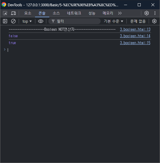 두번째는 false의 반대의 반대 이므로 false가 출력 될 것이다.