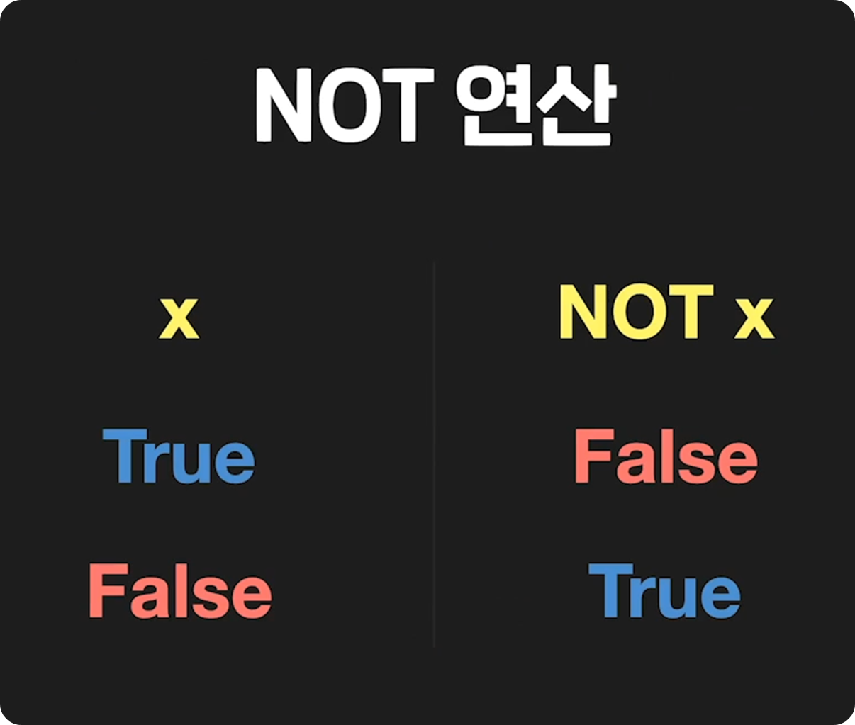 반대로 뒤집어 주는 역할을 하며 말 그대로 참이면 거짓으로 만들어주고 거짓이면 참으로 만들어준다