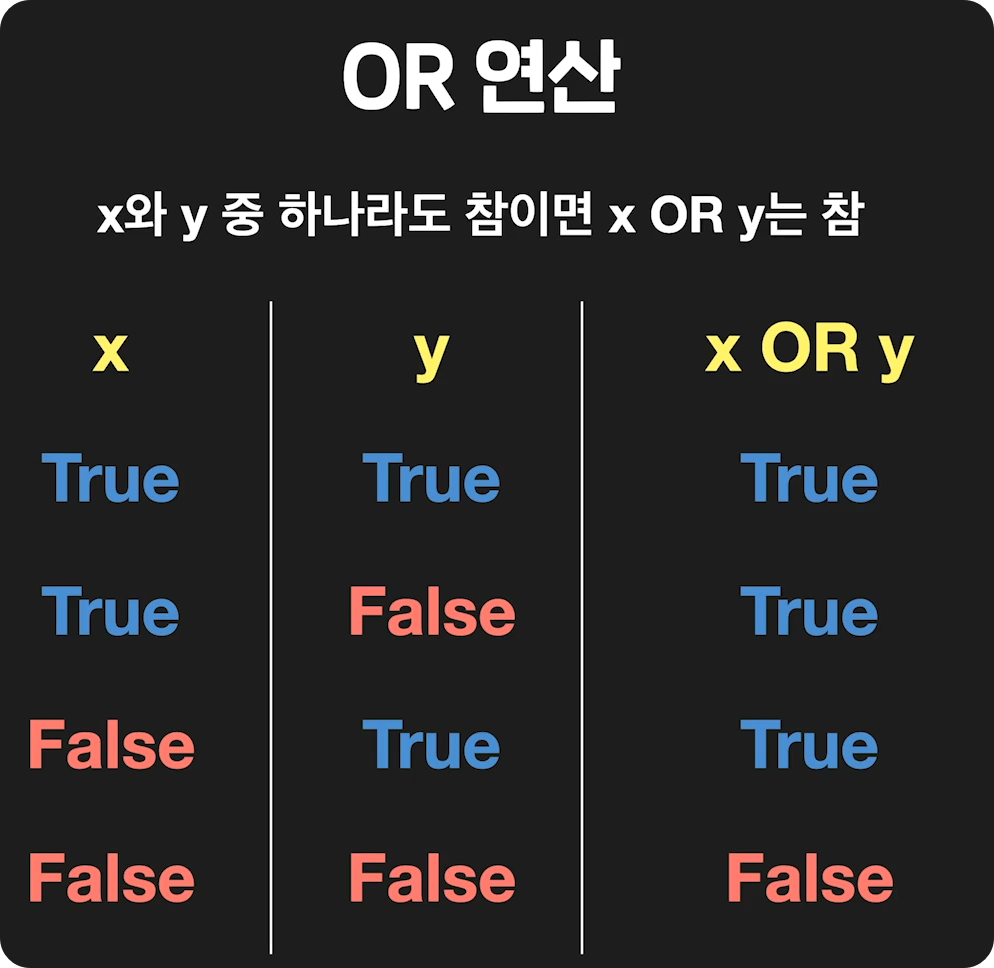 OR 연산은 두 명제 중 하나라도 true이면 x OR y는 true, 둘 다 거짓이면 false