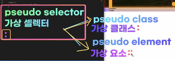가상셀렉터 가 두개로 분리되는데 1,가상클래스,2.가상요소 두가지로 나뉘어지는데