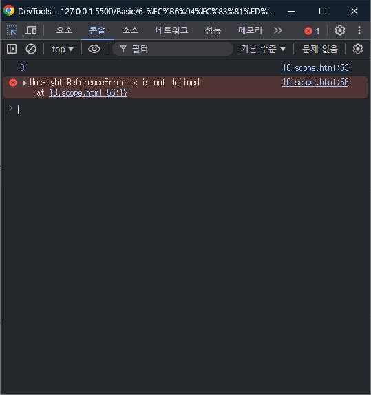 맨 밑줄에 사용한 변수 x는(console.log(x)) 변수 x가 유효하지 않은 곳에서 사용한 것이기에