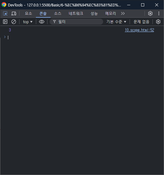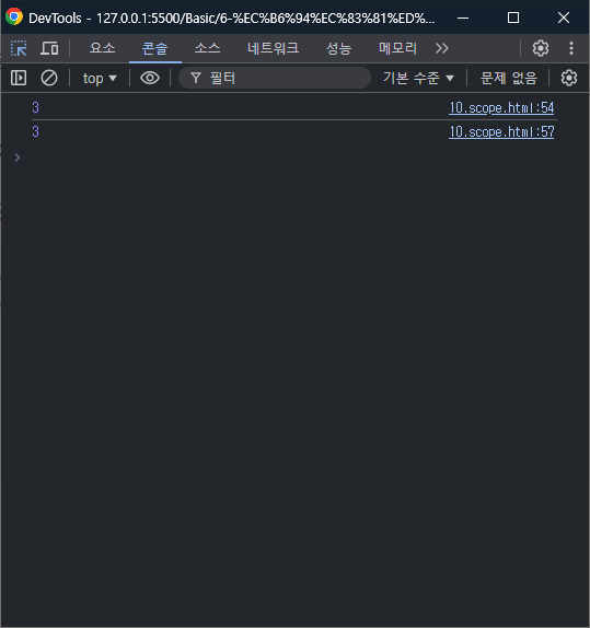 그렇기 때문에 자연스럽게 글로벌 변수 x가 사용되면서 콘솔에는 3이출력 되는 것이다.
