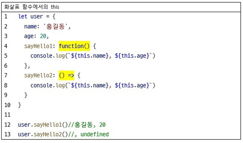 //객체 내에 함수를 화살표 함수로 선언하는 것이 문제가 되는 것이 아니라