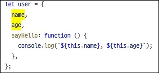 • 객체 리터럴에 값을 등록할 때 객체 외부에 선언된 변수의 값도 대입이 가능하며