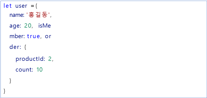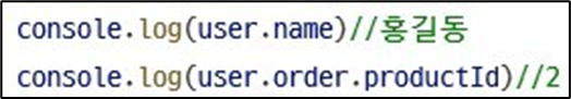 또한 user 객체의 order 프로퍼티가 객체이고 이 order 객체의 productId 에접근하려면user.order.productId를 쓴다.