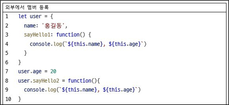 • 객체 리터럴은 { } 안에 객체 멤버를 등록하는데, 객체를 선언하고 이후에 그 객체에 멤버를 추가할 수도 있다.